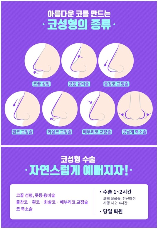 코 성형은 콧대, 코끝, 콧 볼, 매부리, 휜 코 등을 교정하는 수술로 나뉘며, 상태에 따라 단일수술법 혹은 복합수술법으로 얼굴의 밸런스를 고려하여 수술을 진행한다