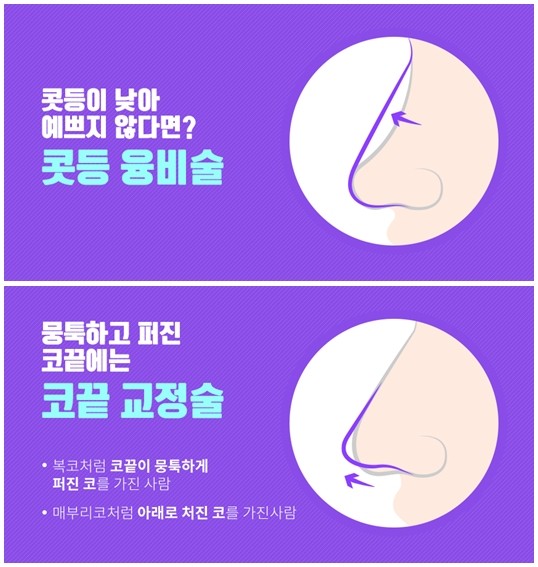 ▶ 매부리코 교정술 = 동양인의 경우 코끝과 코의 맨 윗부분이 코의 중간 부위보다 상대적으로 낮아서 매부리코처럼 보이는 경우가 많다. 이런 경우 돌출된 부위를 깎아주는 수술과 코의 윗부분을 높여주는 융비술을 이용해 교정하게 된다.
